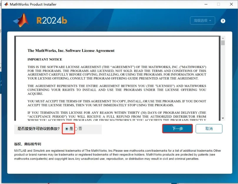 4. 软件安装许可协议接受,勾选【是】,然后点击【下一步】。