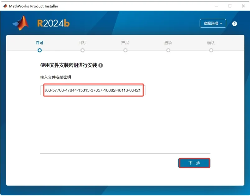 5. 输入文件安装密钥: