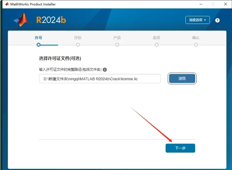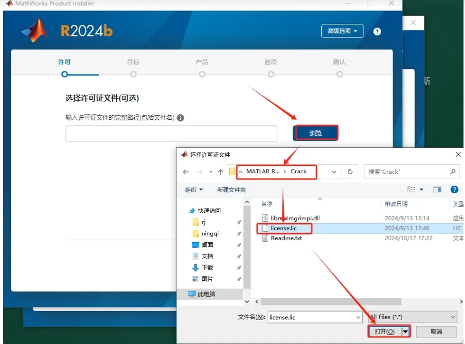 6. 选择许可证文件,点击【浏览】进入,找到安装包Crack文件夹里的【license.lic】文件并打开。