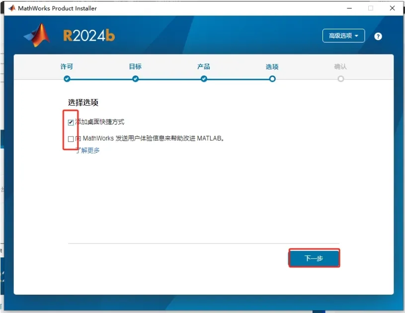 10. 勾选“添加桌面快捷方式”,取消“MathWorks 发送用户体验信息来帮助改进 MATLAB”,然后点击【下一步】。