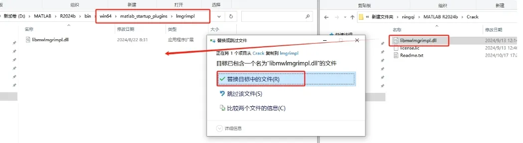 16.将【libmwlmgrimpl.dll】复制到软件安装目录下的`\bin\win64\matlab_startup_plugins\lmgrimpl`文件夹里替换,替换成功则软件破解完成。