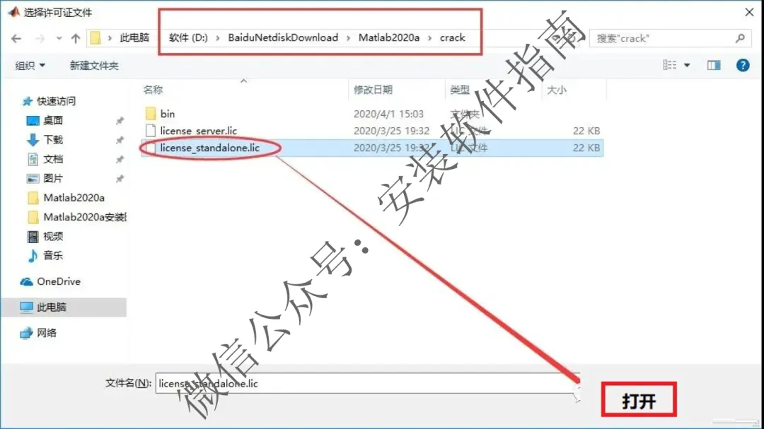 9、在跳出的框内找到第二步解压出来的Matlab2020a文件夹,打开里面的crack文件,选中license_standalone.lic文件,并打开它
