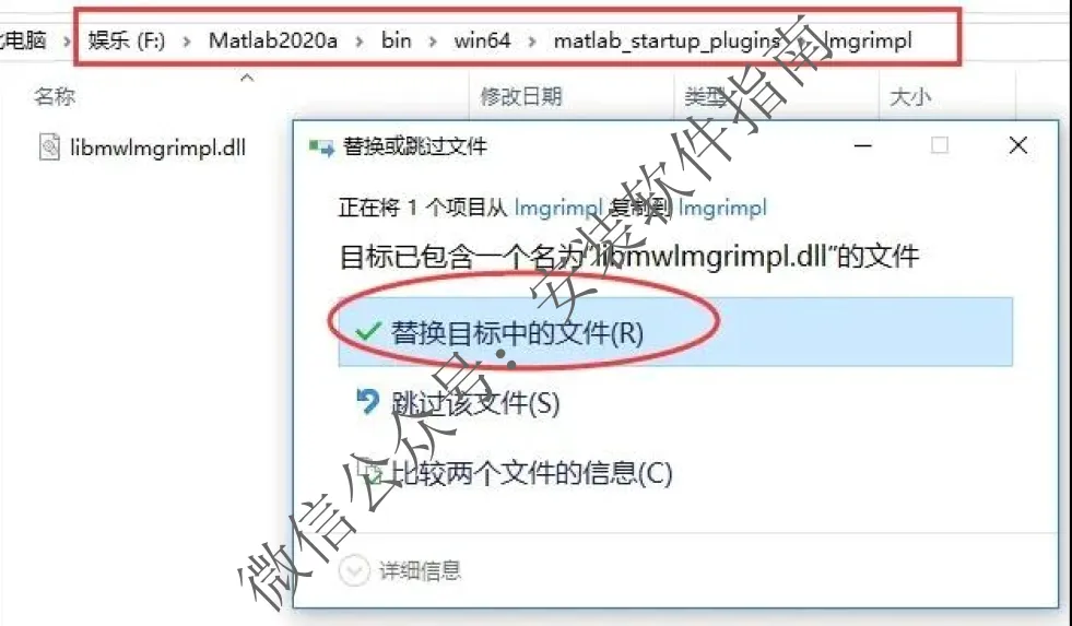 23、将它粘贴到安装目录(第11部让你记住的位置)bin\win64\matlab_startup_plugins\lmgrimpl文件夹里面,并选择替换。很多人这一步不会,意思就是把安装包里的win64这个文件夹里的文件进行复制,粘贴到软件的安装位置的bin-win64的位置下,去替换同名文件。