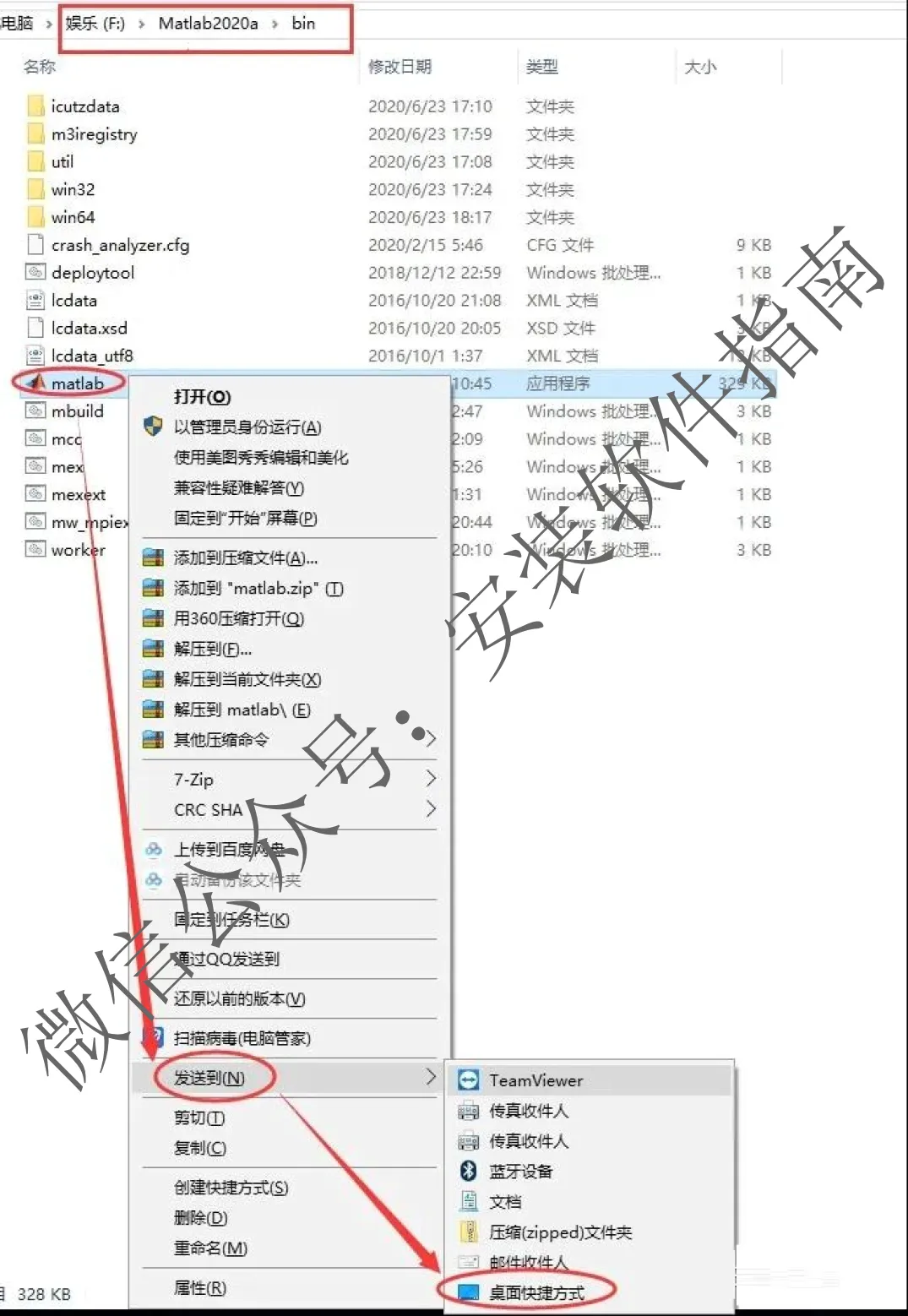 24、接着还在安装目录,打开bin文件夹,找到matlab文件,右键发送到桌面
