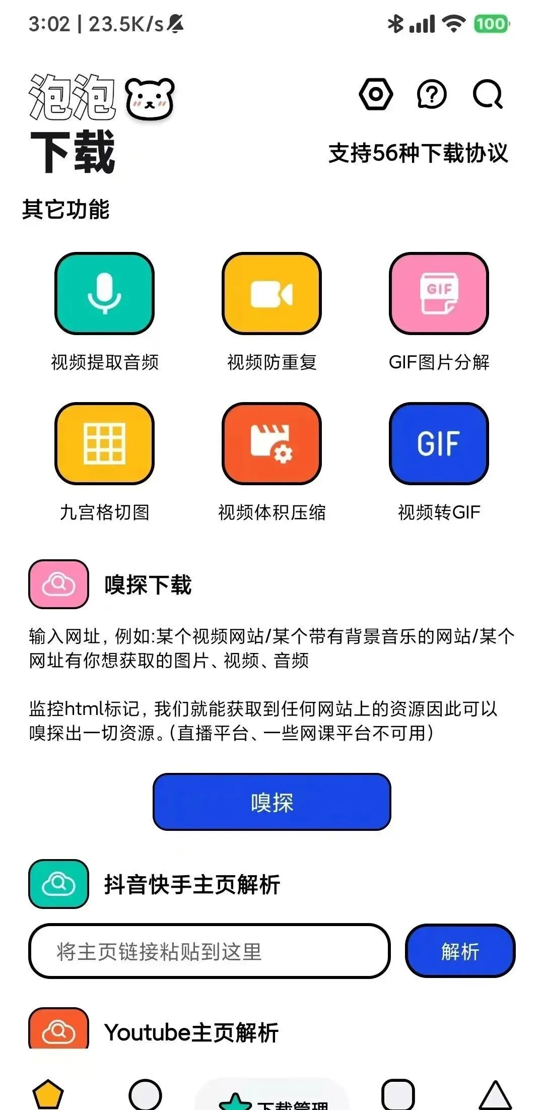 内置56种下载协议,是万能下载器,不限速只是基本操作,还能下载抖音、快手、B站等平台的短视频并去水印。界面干净,复制链接就能自动识别,无需多余操作,下载速度基本能跑满带宽。