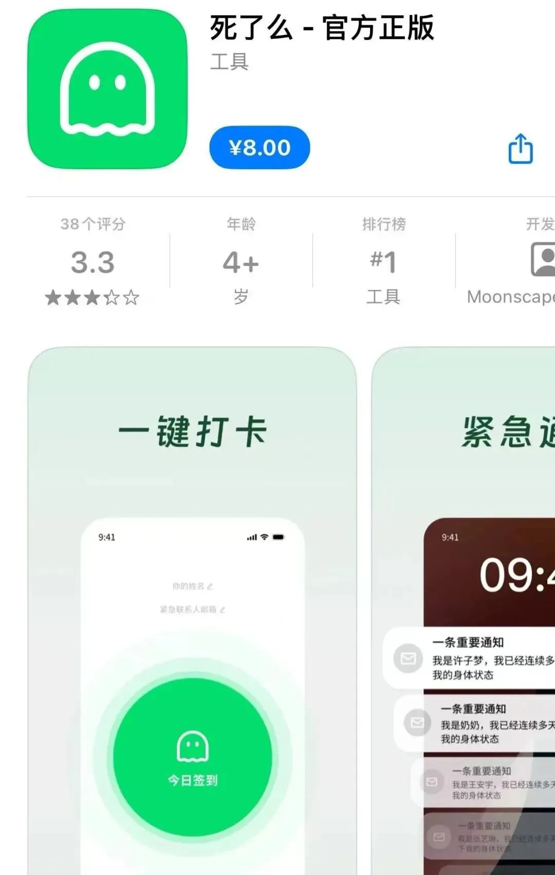 并且我觉得这款App的爆火,只是因为名称起的过于猎奇才引发了人们的关注,这种爆火通常都是有“保质期”的,App从一开始的免费涨到8元,其实就是开发者在“收割大家的好奇心”火了之后,有不少人认为“死了吗”这个名称不好听,建议改名为“活着吗”,你觉得叫什么名字更好?从免费涨到8块,功能却极其简单,如果是你,现在8块你还会购买吗?