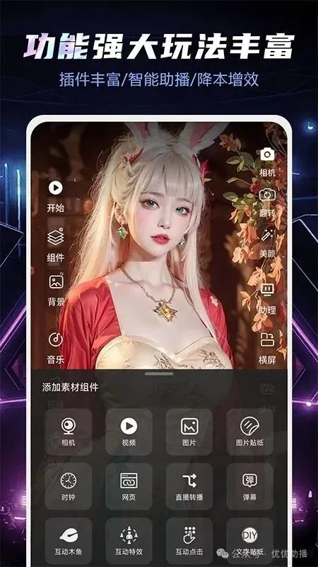 优优助播是一款专为普通大众主播量身定制的新一代智能互动直播助手工具,是手机优优助播直播工具,除了提供1080P高清抠像、海量素材、绿幕特效、强大美颜、视频拍摄、背景音乐、搞笑音效、直播间模板、多场景切换、多图层搭建、多平台推流直播等功能,还提供弹幕整蛊、自动触发、互动工具、加班挑战、木鱼、时钟、飘屏互动等功能。一部手机就能让你轻松搭建高大上的大流量主播同款虚拟直播间!无论你是直播小白还是直播大咖都可以快速上手,帮助你实现电影直播、睡眠直播、本地团购直播、电商直播、游戏直播、聊天直播、音乐直播、娱乐直播等等。无需颜值、才艺,甚至无需过多的时间和精力,只需要一点点拼劲,就能踩着直播风口起飞!