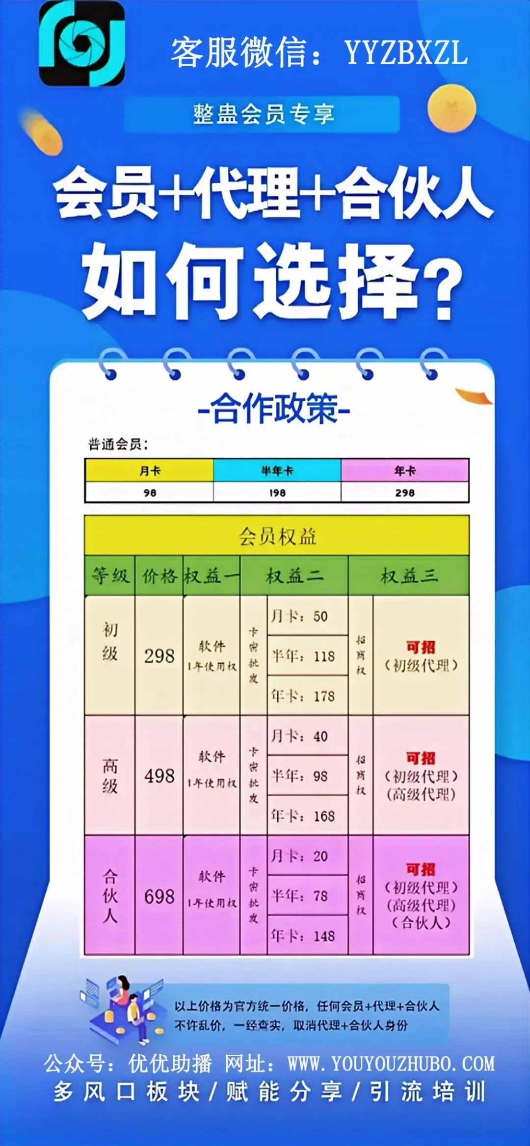 合伙人后续拿激活码:月卡20 半年卡78 年卡148(简单易学,不用担心学不会,引流方法技巧免费共享,合伙人享受兜底政策,没激活的卡可以随时退换)(优优助播合伙人698付好后+YYZBXZL或者+303236072发截图领取权益,爽快的朋友除了格外赠送秘密素材之外还有其他惊喜)