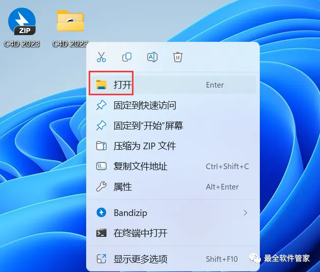 15、回到桌面,右键桌面上的【C4D 2023软件图标】,点击【打开】