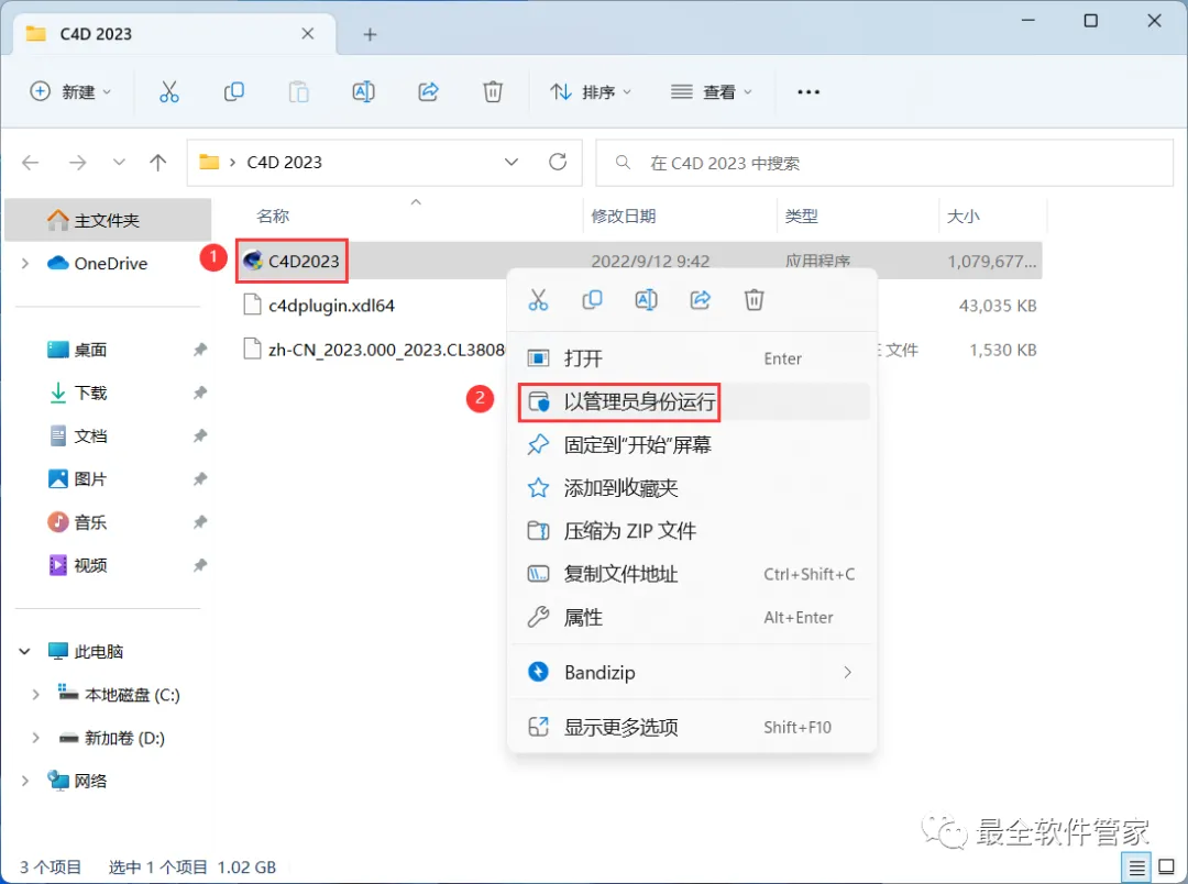 3、找到【C4D2023】应用程序,右键选择【以管理员身份运行】它