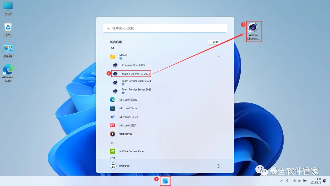 9、回到桌面,点击任务栏的【开始菜单】,在【所有应用】中找到【Maxon Cinema 4D 2023软件图标】,将软件图标拖到桌面上,完成软件桌面快捷方式的创建