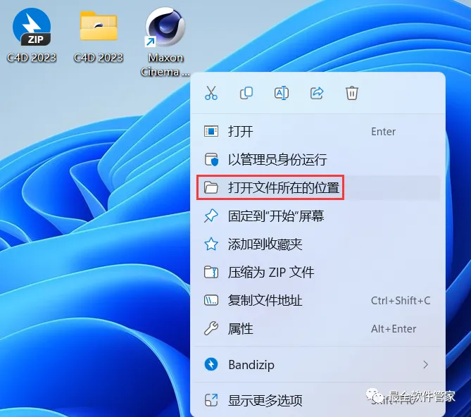 11、回到桌面,右键桌面上的【C4D 2023软件图标】,点击【打开文件所在的位置】
