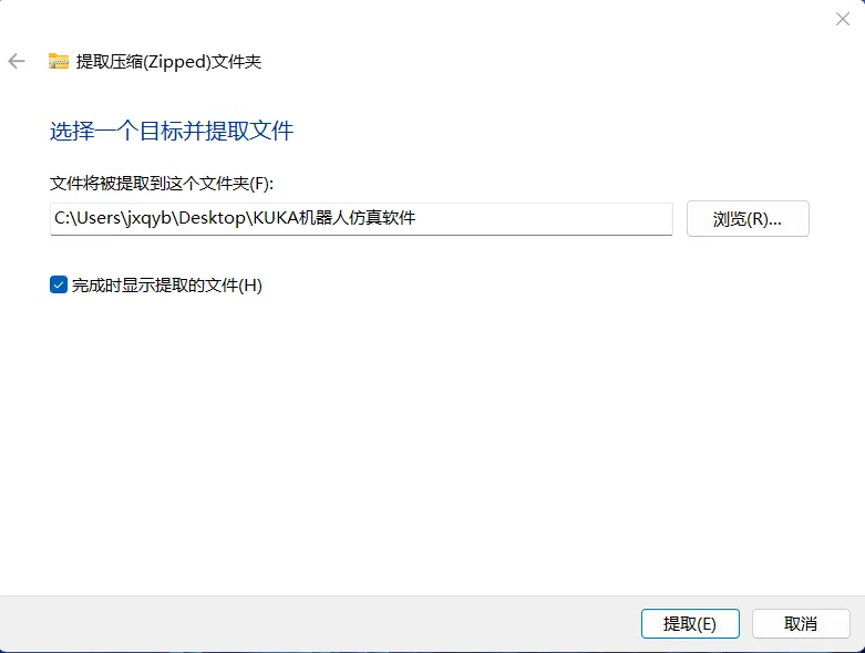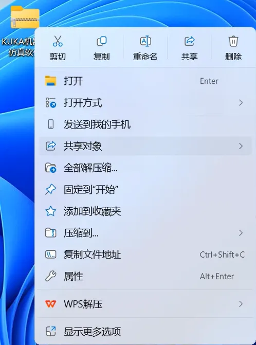 2.1,鼠标右击【KUKA机器人仿真软件】压缩包(Win11系统需先点击“显示更多选项”)选择【全部解压缩】。如下图: