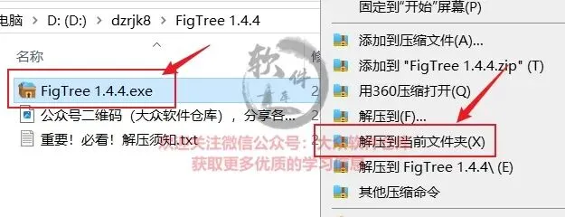1.把资源从网盘下载到电脑上面,右键FigTree 1.4.4.exe压缩包选择解压到当前文件夹;