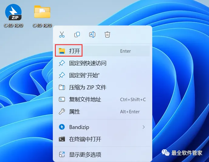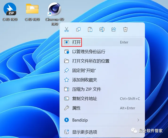 28、回到桌面,右键桌面上的【Cinema 4D R20软件图标】,点击【打开】