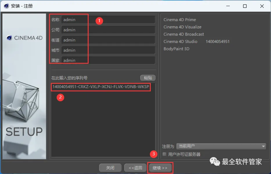 7、随意填写,序列号输入:14004054951-CRKZ-VXLP-XCNJ-FLVK-VDNB-WKSP,再点击【继续】
