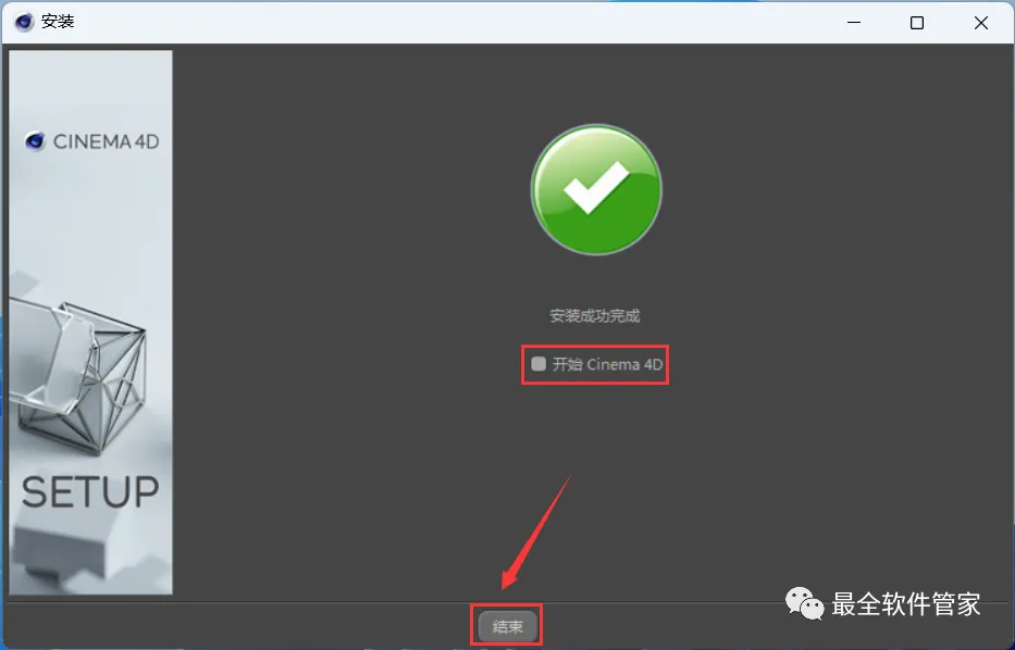 13、不勾选【开始 Cinema 4D】,再点击【结束】