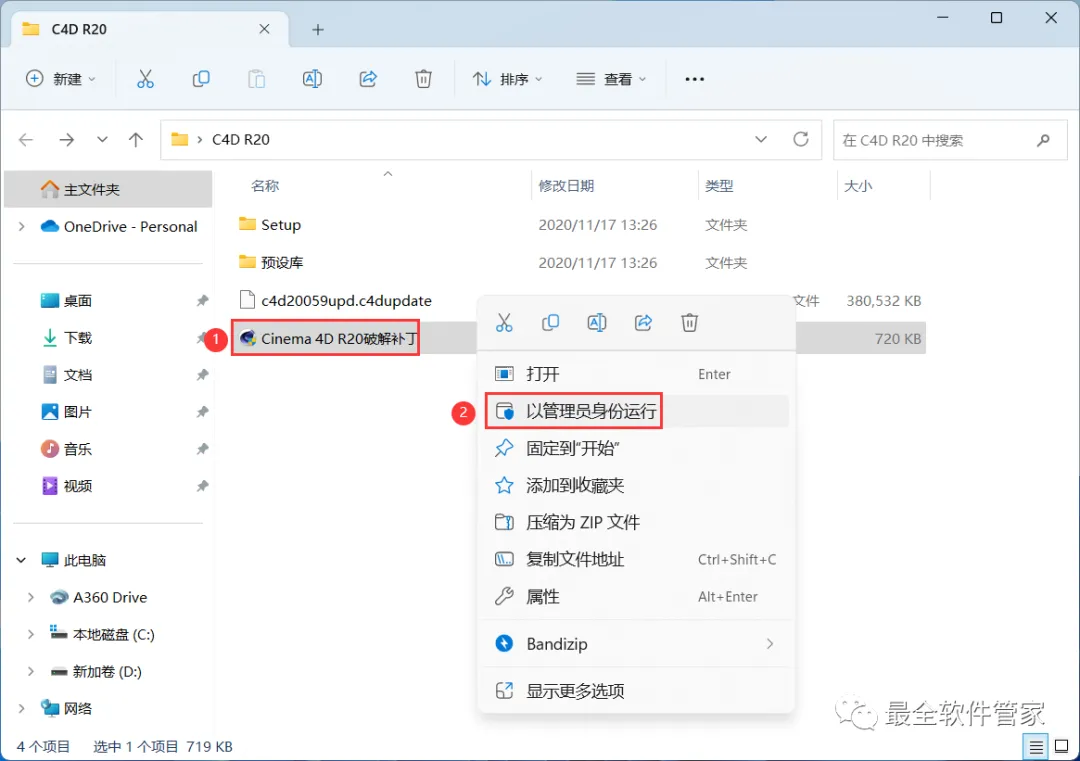 14、回到C4D R20文件夹,找到【Cinema 4D R20补丁】程序,右键选择【以管理员身份运行】它