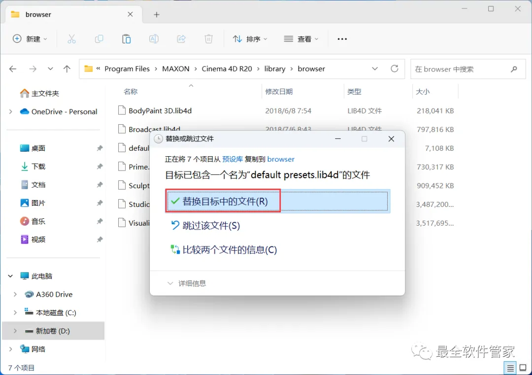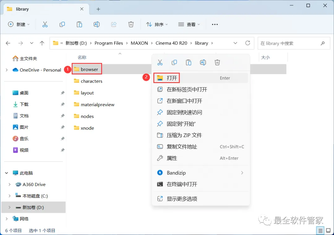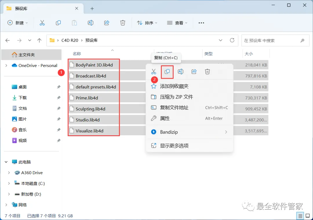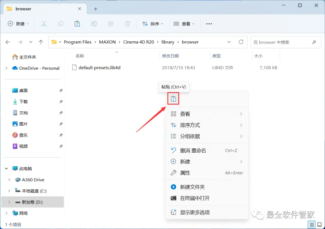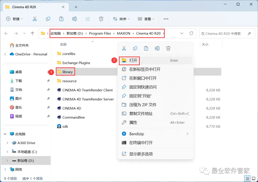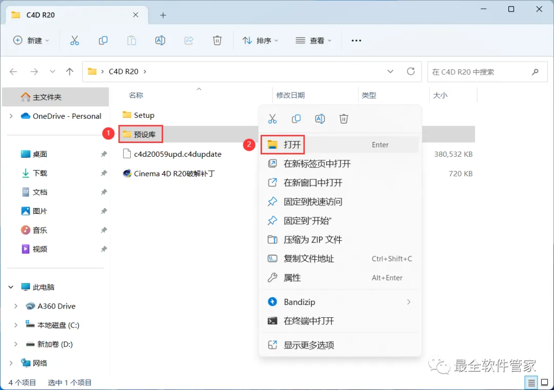 21、回到C4D R20文件夹,找到【预设库】文件夹,右键【打开】它