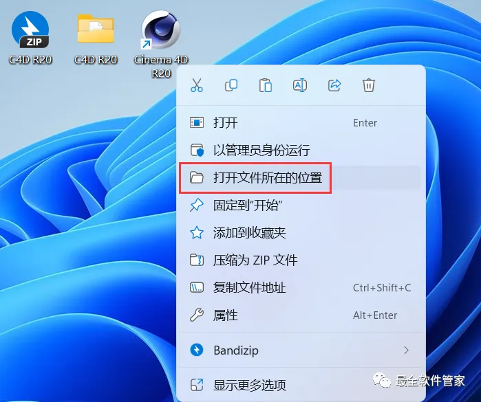 23、回到桌面,右键桌面上的【Cinema 4D R20软件图标】,点击【打开文件所在的位置】