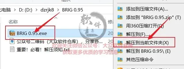 1.把资源从网盘下载到电脑上面,右键BRIG 0.95.exe压缩包选择解压到当前文件夹;