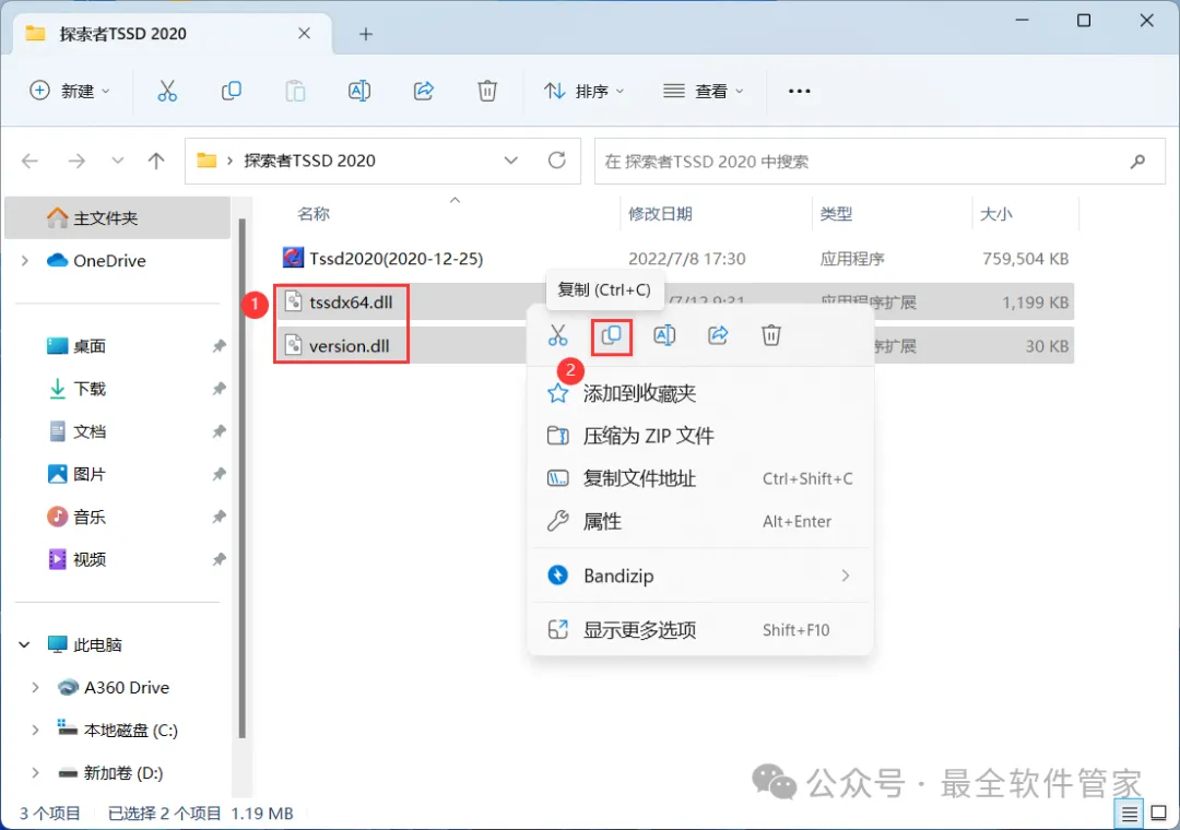 11、回到探索者TSSD 2020文件夹,找到并选中【tssdx64】和【version】文件,右键点击【复制按钮】