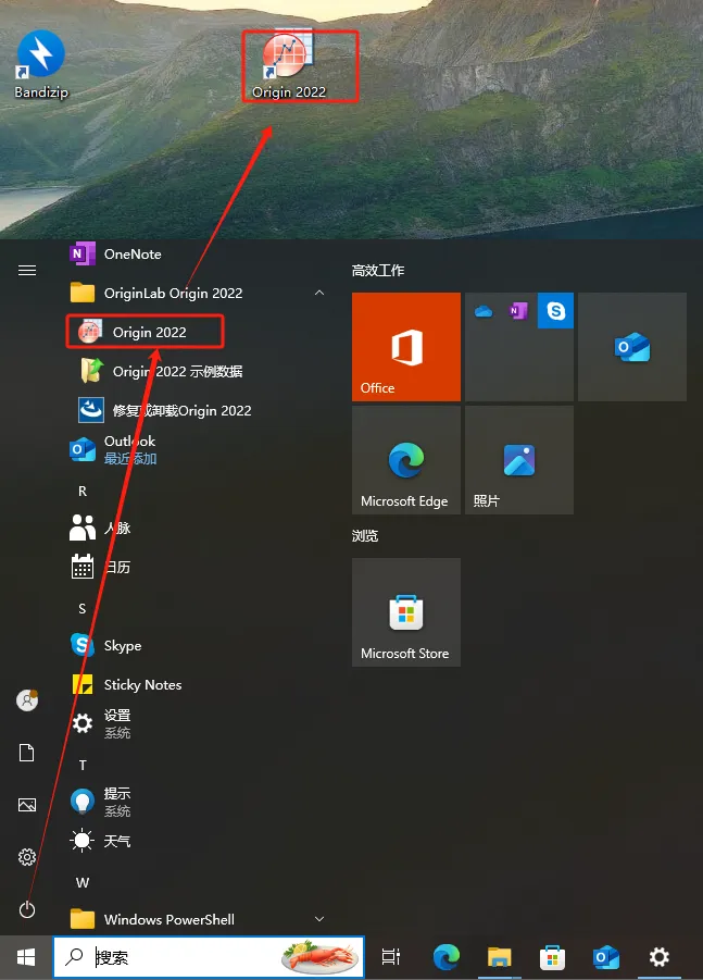 第二十一步:点击电脑【开始】,找到安装的【Origin 2022】图标,将其拖到桌面。如下图所示。