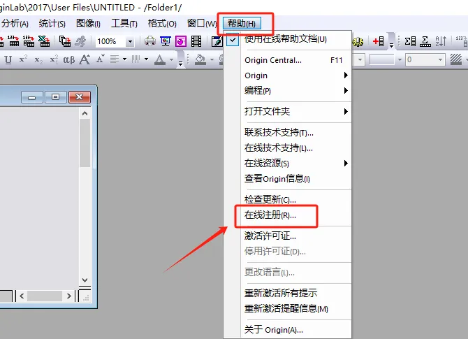第三十四步:点【帮助】,【在线注册】。