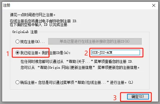 第三十五步:勾选【我已经注册】,输入以下注册ID【0IE-J22-ACM】,点击【确定】。