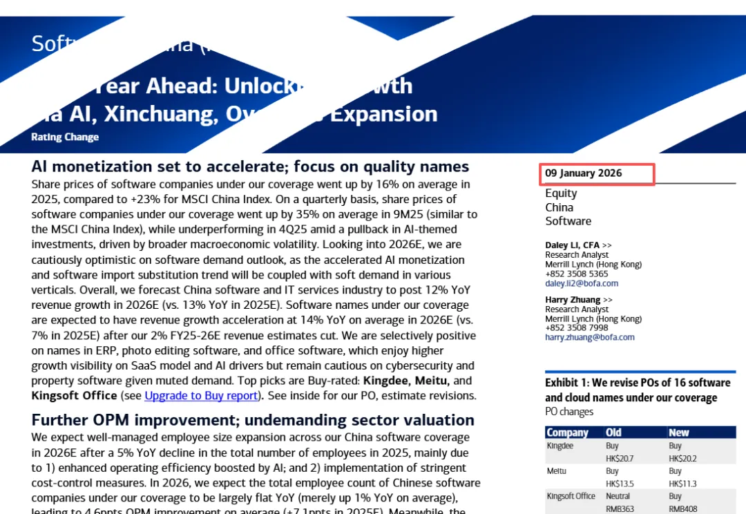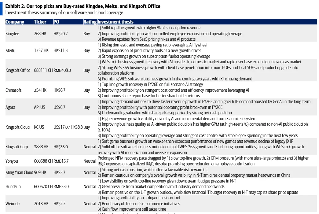 例如,金蝶国际、美图公司和金山办公等企业,凭借其领先的技术实力和广阔的市场前景,被美银给予了“买入”评级。