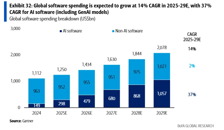 美银预测,AI技术的商业化进程将进一步加快,带动相关软件企业的收入持续增长。