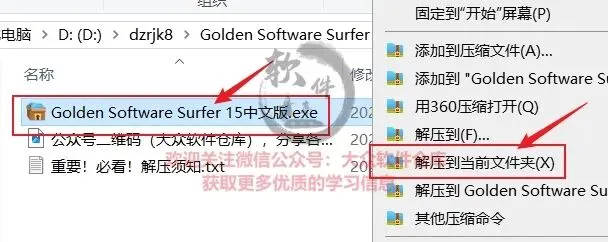 1.把资源从网盘下载到电脑上面并右键Golden Software Surfer 15中文版.exe压缩包选择解压到当前文件夹;