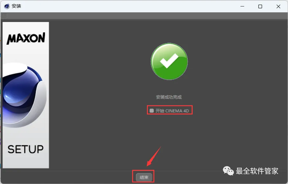 16、不勾选【开始 Cinema 4D】,再点击【结束】