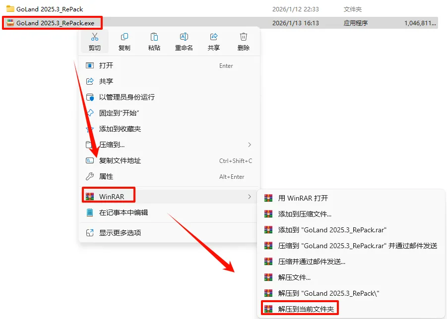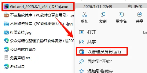 2.打开刚刚解压的文件夹,鼠标右键点击“GoLand_2025.3.1_x64-(IDE`a).exe”选择“以管理员身份运行”