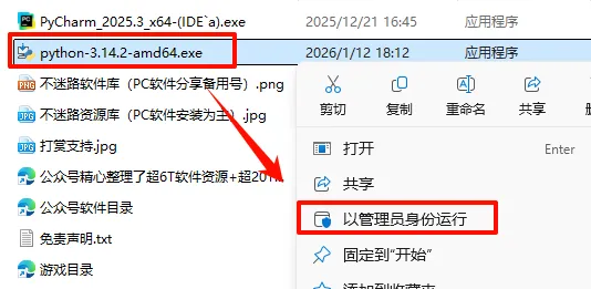 2.打开刚刚解压的文件夹,鼠标右键点击“python-3.14.2-amd64.exe”选择“以管理员身份运行”