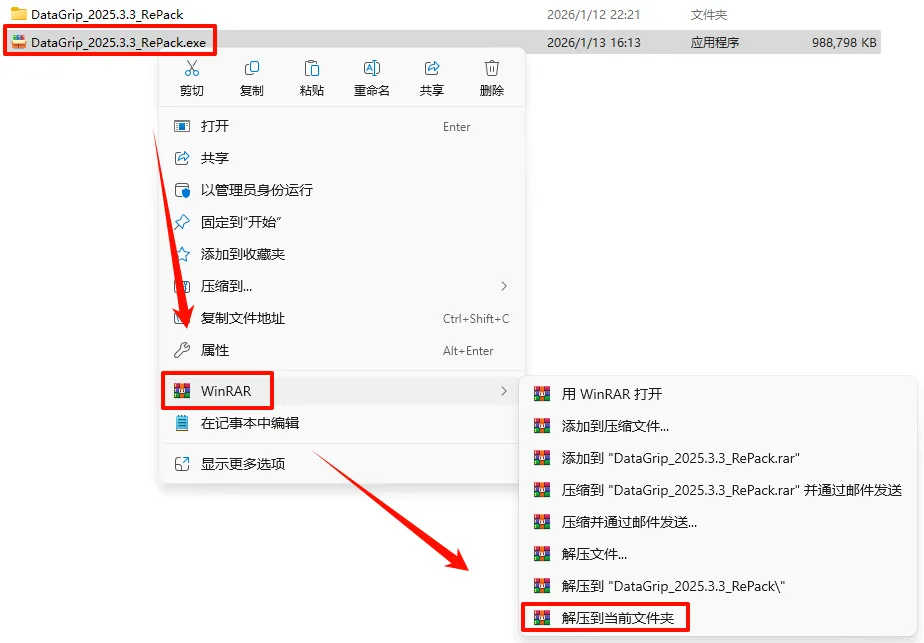 2.打开刚刚解压的文件夹,鼠标右键点击“DataGrip_2025.3.3_x64-(IDE`a).exe”选择“以管理员身份运行”