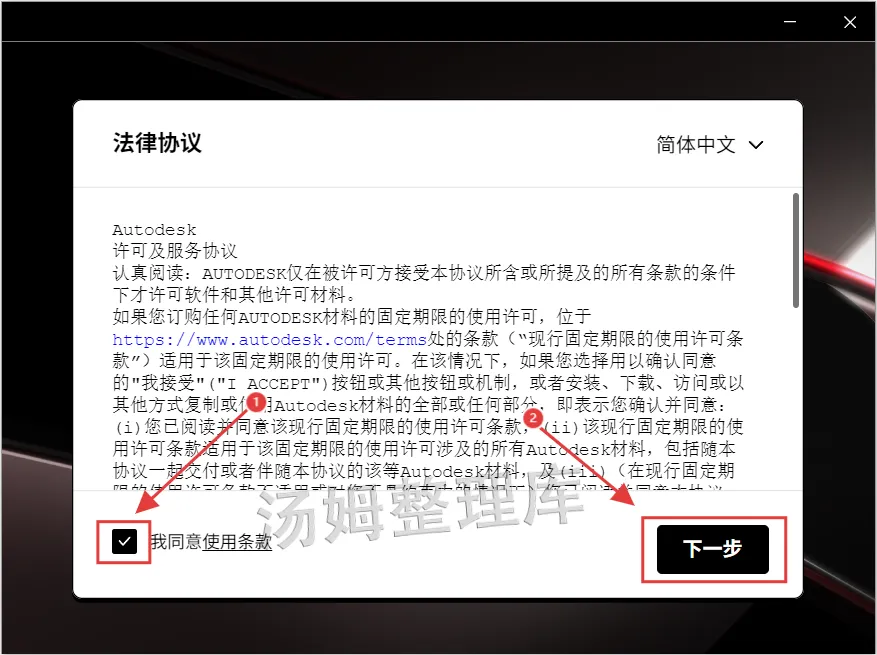 5.先勾选【我同意使用条款】,再点击【下一步】。