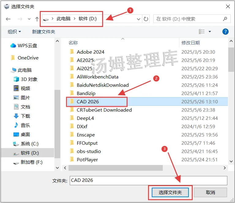 7.例如:可以在电脑的D盘新建一个【CAD2026】文件夹,选中后点击【选择文件夹】。(注意!安装路径和文件夹命名不要带有中文)