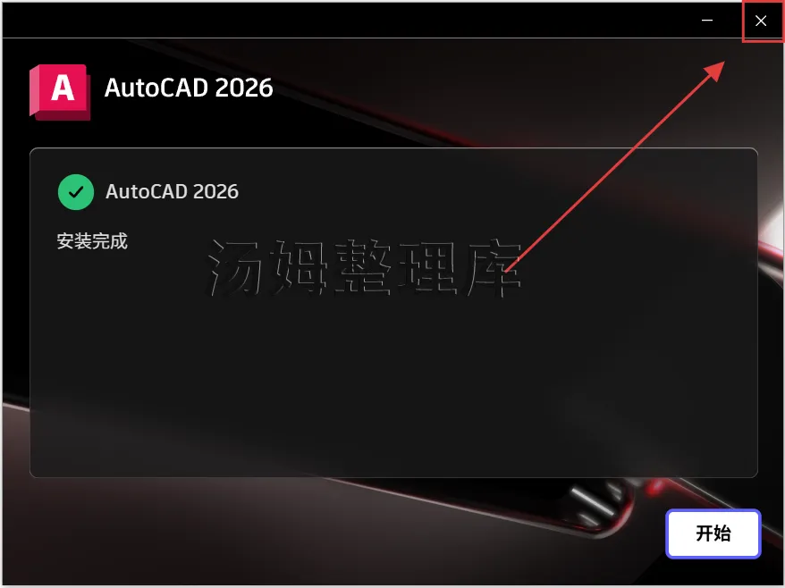 10.显示安装完成,直接点击【X】关闭窗口。(不要点击【开始】)