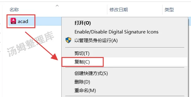 2.选中【acad】文件,鼠标右键选择【复制】操作。