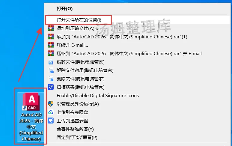3.退出到电脑桌面,选中刚安装好的【CAD2026图标】,右键选择【打开文件所在位置】。