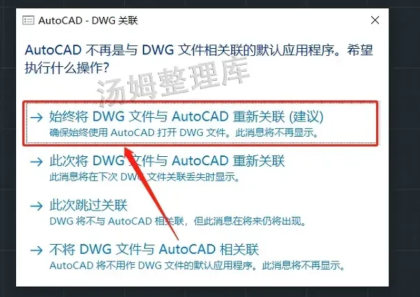 7.如有以下弹窗,点击【始终将DWG文件与AutoCAD重新关联】