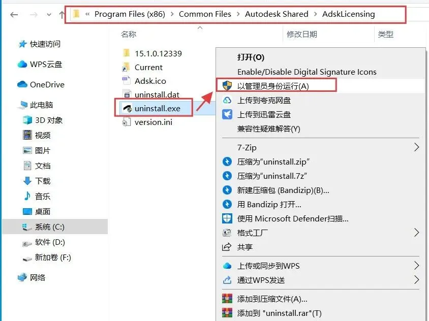 可以复制此路径【C:\Program Files (x86)\Common Files\Autodesk Shared\AdskLicensing】粘贴到我的电脑上方的地址栏,然后按【回车键】打开,选中下图所示文件,鼠标右键选择【以管理员身份运行】,运行完后可以重新运行安装。