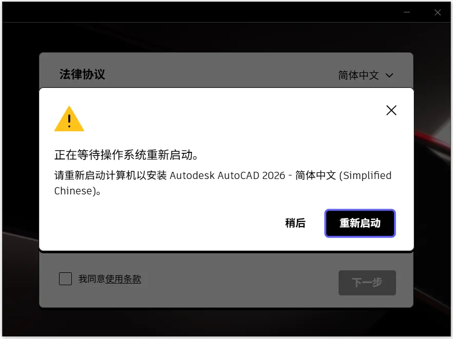 (正在等待操作系统重新启动。请重新启动计算机以安装Autodesk....)