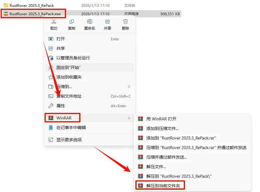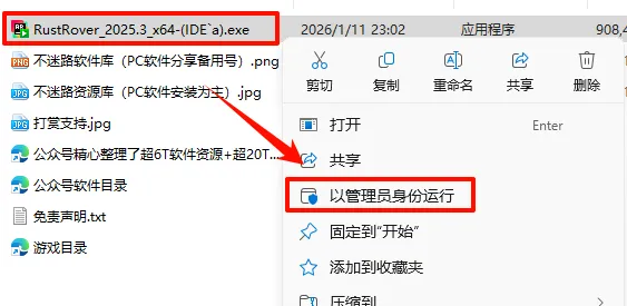 2.打开刚刚解压的文件夹,鼠标右键点击“RustRover_2025.3_x64-(IDE`a).exe”选择“以管理员身份运行”