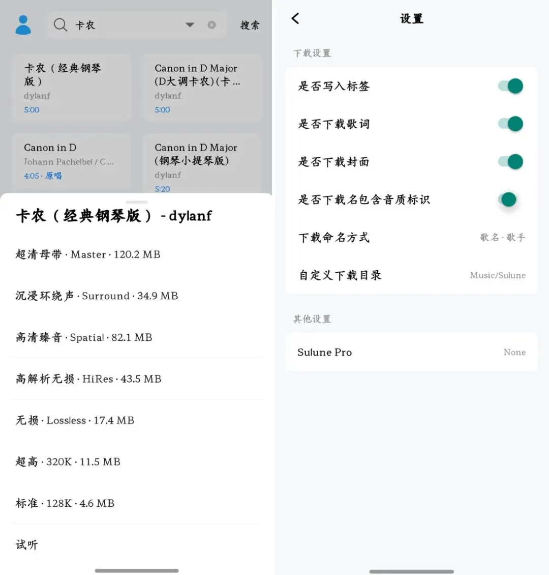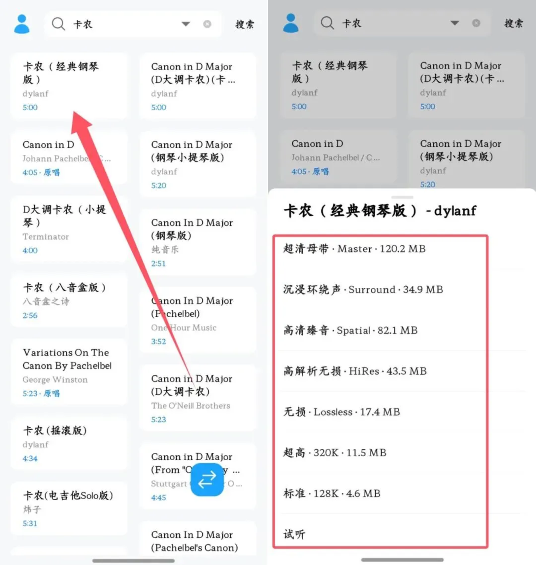 设置完成之后,在APP的首页搜索框中,输入你需要下载的歌曲名称或者是歌手名称,点击你需要下载的歌曲,就会弹出该歌曲各种音质的下载方式,最高可以下载超清母带级别,并且支持在线试听。
