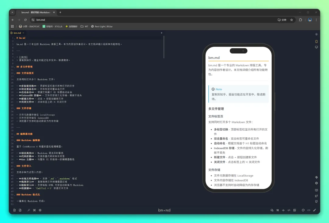 免费开源 Markdown 排版助手「bm.md」一键适配微信公众号网页与图片,专为内容创作者设计,支持 Markdown 语法实时着色、支持折叠代码块和长段落等功能。