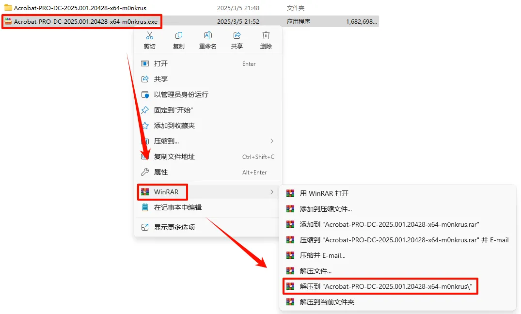 1.选中下载的压缩包,然后鼠标右键选择解压到"Acrobat-PRO-DC-2025.001.20428-x64-m0nkrus"(没有解压选项点这里)