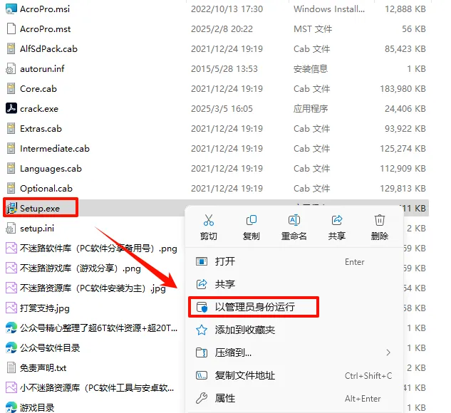 2.打开刚刚解压的文件夹, 鼠标右键点击“Setup.exe”选择“以管理员身份运行”
