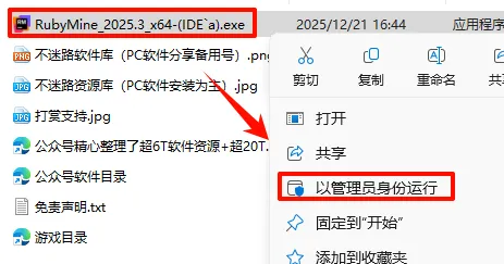 2.打开刚刚解压的文件夹,鼠标右键点击“RubyMine_2025.3_x64-(IDE`a).exe”选择“以管理员身份运行”